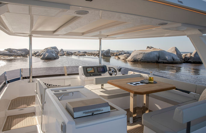 雖屬40呎級距,Leopard 40 在空間規劃上毫不妥協,從飛橋到後甲板,再到寬敞明亮的沙龍與船艙,每一處皆展現雙體船的極致空間優勢。船艙內部採用大面窗設計,讓自然光充分灑入,無論日間巡航或夜晚停泊,都能享受通透舒適的氛圍。